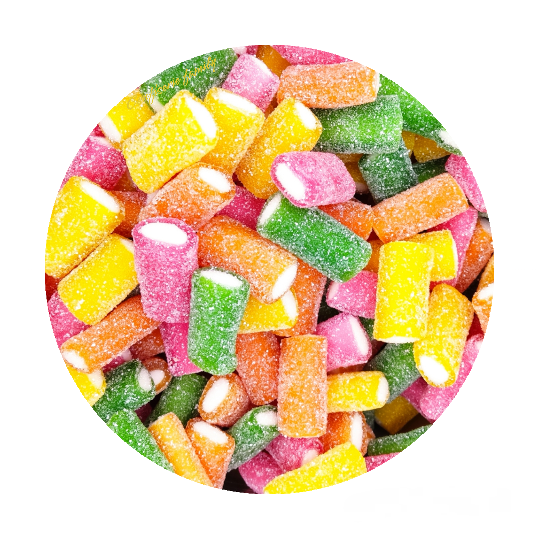 (F) CONFISERIE ACIDIFIÉE / Ingrédients: sucre; sirop de glucose; amidon de maïs; humectants: sorbitol, sirop de sorbitol; dextrose; acidifiants: acide citrique, acide malique; correcteurs d'acidité: citrate tricalcique, malate acide de sodium, citrate trisodique; agent d'enrobage: cire de carnauba; amidon de BLE; farine de BLE; graisse de palme; gélatine; émulsifiant: mono- et diglycérides d'acides gras; arôme; concentrés de fruits et de plantes: patate douce, pomme, radis, cassis; colorants: curcumine, bleu patenté V. Tenir à l'abri de la chaleur et de l'humidité. Peut contenir des traces de LAIT